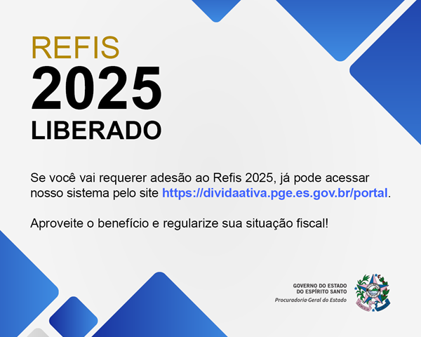 Notícias Refis 2025 tem redução de até 100% em juros e multas Palestras e apresentação de dança marcam o Dia da Consciência Negra na PGE Regularize Capixaba lança novo edital para devedores Servidores da Sejus e PGE participam de capacitação de projetos financiados pelo BID Previous Next
