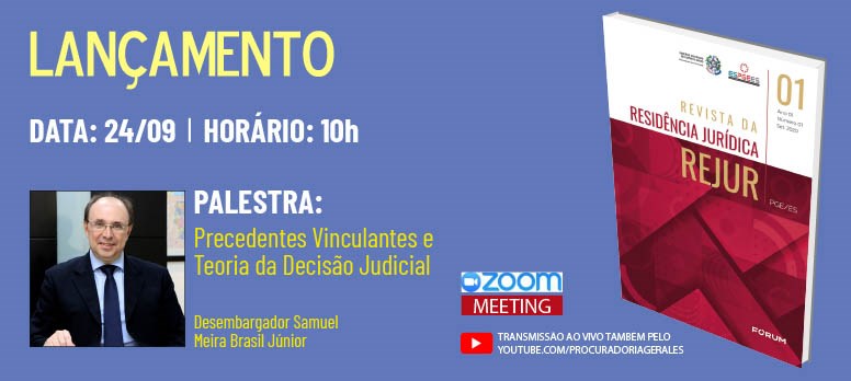 O Programa de Residência Jurídica da Procuradoria-Geral do Estado (PGE) lança, na quinta-feira (24), a partir das 10h, a primeira edição de sua revista científica. O evento será remoto, com transmissão pelo canal da PGE no YouTube, e terá a participação do desembargador e presidente do Tribunal Regional Eleitoral do Espírito Santo (TRE-ES), Samuel Meira Brasil Júnior, que fará uma palestra sobre “Precedentes vinculantes e Teoria da Decisão Judicial”.