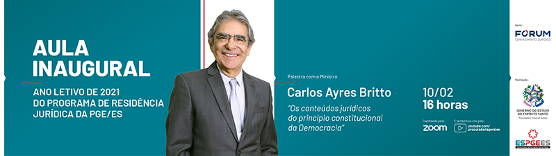 O Programa de Residência Jurídica da Procuradoria-Geral do Estado do Espírito Santo (PGE) inicia seu ano letivo de 2021 com a realização de mais um evento: será a aula inaugural com o ministro do Supremo Tribunal Federal (STF), Carlos Ayres Britto, falando sobre “Os conteúdos jurídicos do princípio constitucional da Democracia”.
