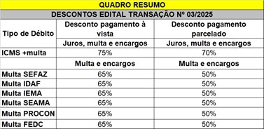 O edital prevê, para os débitos de ICMS com fatos geradores até 31/03/2025, descontos de até 75% nos juros, multas e encargos. Para os demais débitos, descontos de até 65%. Além dos descontos, o novo edital permitirá pagamento em até 120 vezes. Pessoas físicas, microempresas, empresas de pequeno porte ou empresas em processo de recuperação judicial, liquidação judicial, liquidação extrajudicial ou falência, poderão parcelar em até 145 vezes, sem necessidade de apresentação de garantia ou pagamento de entrada mínima.