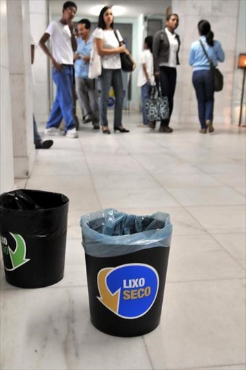 Em todos os ambientes do edifício foram instalados recipientes para a separação correta e adequada dos resíduos gerados. Foram disponibilizados contentores diferenciados para o descarte do papel, dos copos descartáveis e, além dessa diferenciação, será realizada, também, a separação de lixo seco e lixo úmido.